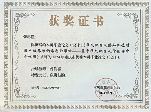 2020级新闻学专业本科生张思滢撰写的《社交机器人感知价值对用户信息采纳意愿的影响——基于社交机器人信任的中介作用》(指导教师为曾润喜教授)获评重庆市优秀本科生毕业论文。