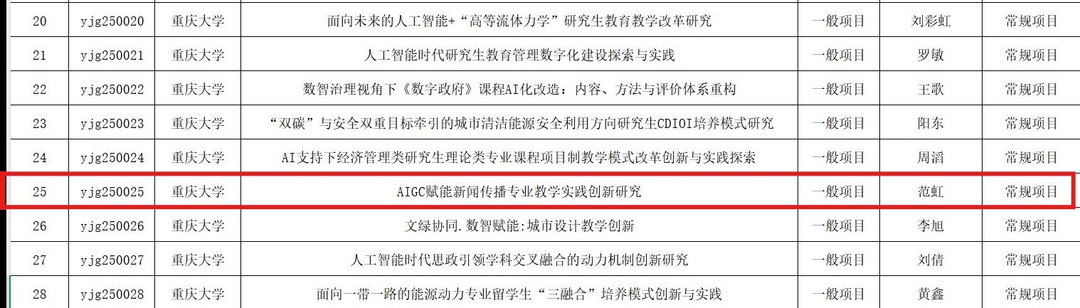 范虹副教授团队申报的“AIGC赋能新闻传播专业教学实践创新研究”项目获批市级一般项目立项。