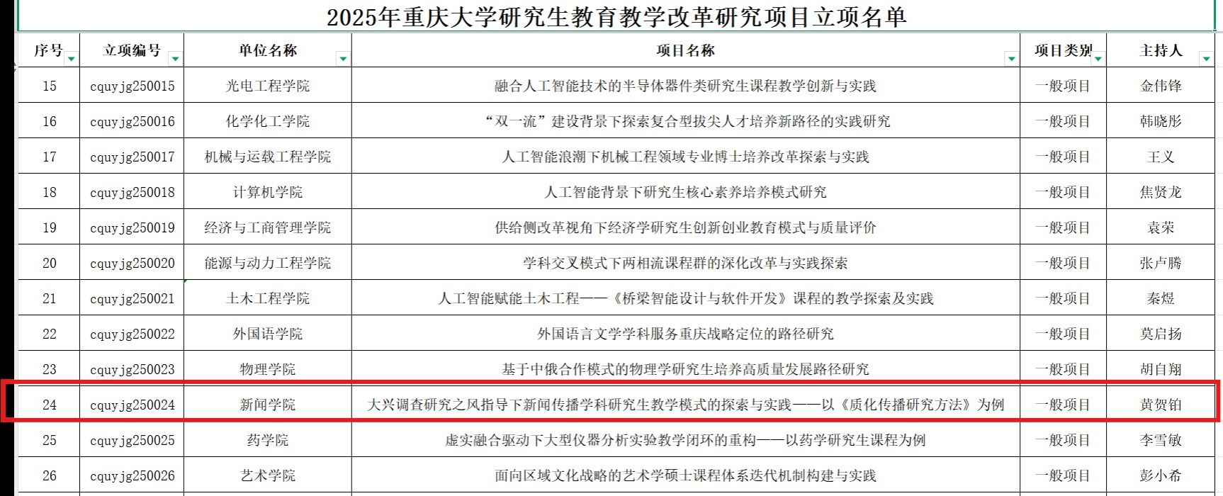此外,黄贺铂副教授团队申报的“大兴调查研究之风指导下新闻传播学科研究生教学模式的探索与实践——以《质化传播研究方法》为例”获批校级一般项目立项。