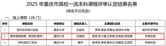 长期以来坚持立德树人、深耕教学内容、创新教学方法成果的肯定。学院将继续以此为契机,持续推进课程体系建设,深化教学改革,强化师资队伍,致力于培养具有坚定理想信念、扎实专业基础、高尚职业伦理的全媒体新闻传播人才,为学校“双一流”建设和重庆市高等教育发展贡献力量。