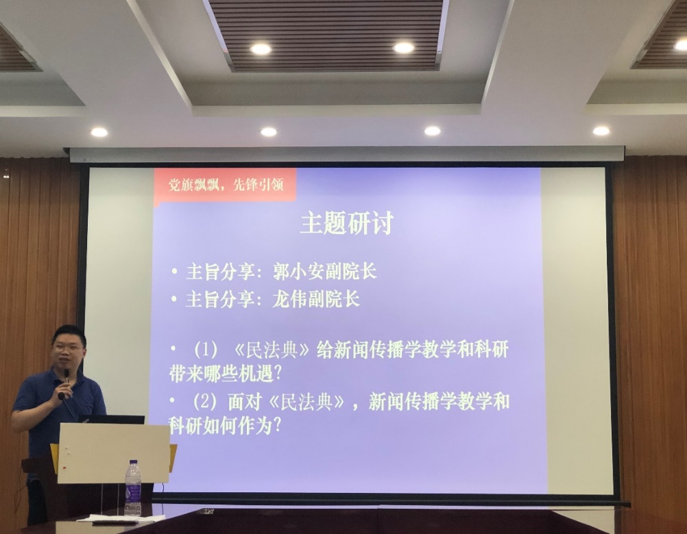 活动议程主要分为三项:第一,学习民法典整体内容和习近平民法典讲义;第二,民法典解读;第三,围绕《民法典》给新闻传播学教学科研带来的机遇以及如何应对这两个问题进行主题学习和研讨。教工支部书记李成波主持了本次学习研讨活动。