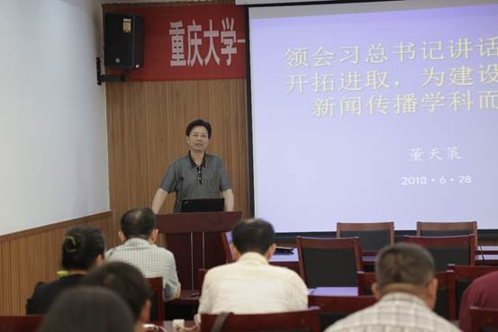 随后,董天策院长以“领会习近平总书记讲话精神,开拓进取,为建设一流的新闻传播学科而努力”为主题,给全体党员讲党课。董院长从“ ‘鼎新’带动‘革故’,创新决胜未来”、“深化科技体制改革,充分释放创新潜能”、“努力成为世界主要科学中心和创新高地”、“坚持党对科技事业领导,描绘科技强国蓝图”等几个方面来分享自己学习讲话精神的体会。结合学校“双一流”建设和内涵发展的要求,董院长提出要聚焦“双一流”,努力开拓进取的行动目标,并分析了“2018广州日报大学新闻传播学一流学科排行榜”中色情网址