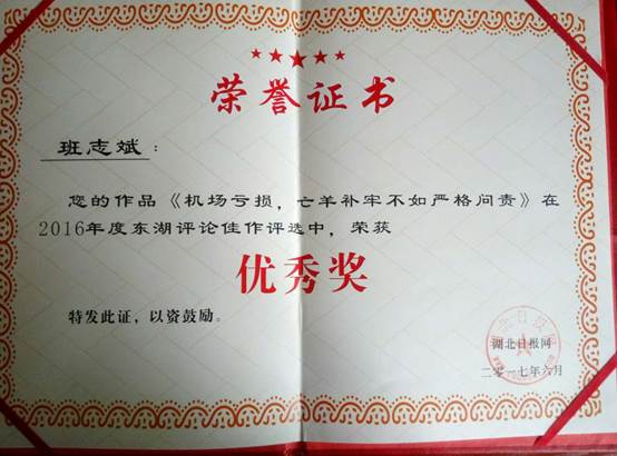 2015级硕士研究生班志斌同学撰写的评论《机场亏损,亡羊补牢不如严格问责》最终荣获了本次评选活动的优秀奖。