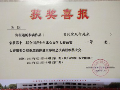 全国青少年冰心文学大赛组委会将于2017年7月在北京举行第十二届全国青少年冰心文学大赛总决赛及颁奖大会。届时中国文联、中国作协领导,全国著名作家、诗人及文学评论家等将出席大会为获奖代表颁奖并合影留念。中央电视台、中国教育电视台、人民网等媒体将对颁奖大会进行报道。组委会特邀我校获奖师生参与总决赛及颁奖大会。预祝参赛选手再创佳绩!