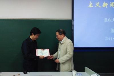 讲座开始前,丁柏铨教授代表南京大学新闻传播学院向董天策教授颁发了“马克思主义新闻观”课程教导委员会高级专家聘书。