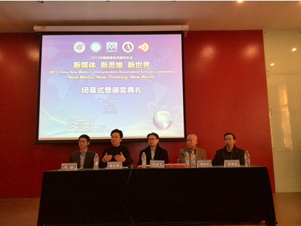 (董天策教授在2013中国新媒体传播年会闭幕式暨颁奖典礼上讲解评奖标准与经过)