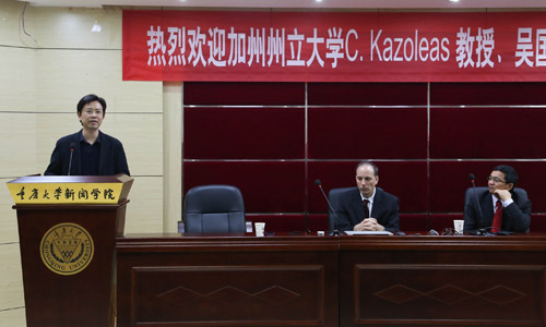 董天策院长主持,讲座前,董院长首先介绍了吴教授的经历:吴教授毕业于清华大学英语系,后赴美留学,获得伊利诺伊大学传播学硕士和德克萨斯大学传播学博士,现在加州大学任教,从事网络传播方向的研究,治学经验丰富。并对同学们提出希望,希望大家能从此次讲座中获益。