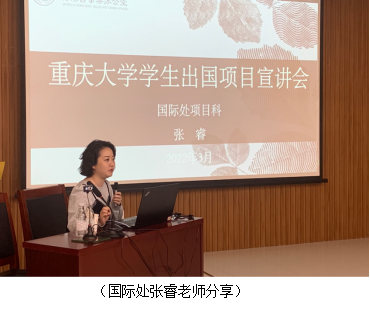 国际处张睿老师对近三年来学校总体留学情况及有关政策进行介绍。她从个人经历、同学故事讲起,谈论出国留学的必要性、重要性,出国深造的经历能够丰富个人生活,提高就业竞争力。同时,她提醒同学们需要及时做好出国留学规划,抓住申请黄金期。目前,学校提供给在校学生200+出国(境)学习交流项目,满足了同学们多样性、个性化的需求。张睿老师详细介绍了交流项目的内容,她鼓励同学们申请国家留学基金委项目和学校提供的交换访学项目。