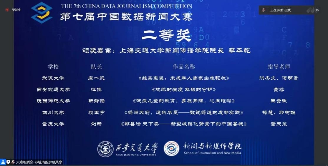 刘畅团队的作品《郡县治 天下安——新型城镇化背景下的中国县城》获二等奖,董天策教授获优秀指导教师。