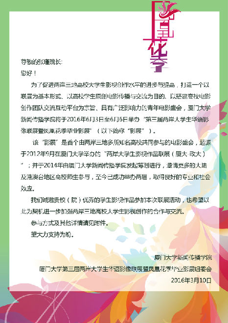 “第三届两岸大学生华语影像联展暨凤凰花季毕业影展”作品征集现已启动,请同学们积极参加: