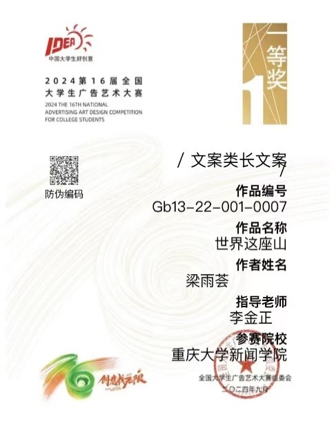 2021级本科生梁雨荟同学获得“文案类长文案”全国一等奖,指导老师为李金正老师。