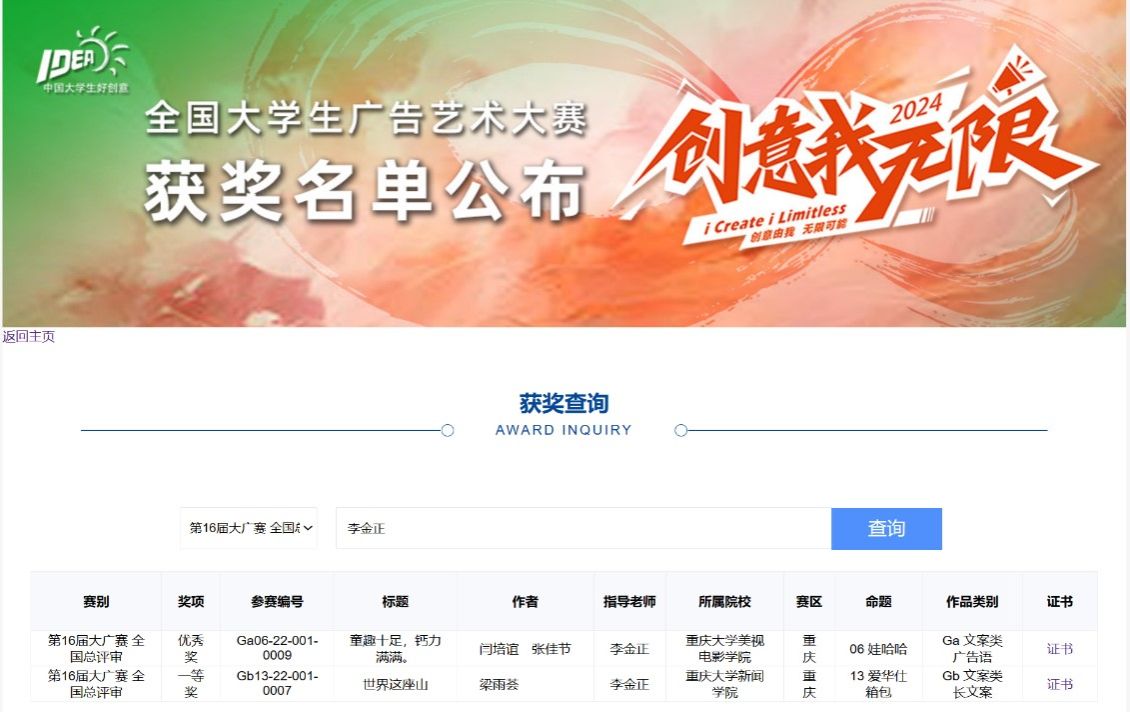 一等奖获得者梁雨荟同学主修的广告学概论课程为“重庆市一流本科课程”,主讲教师李金正副教授曾在第十三届大广赛中指导学生获得平面广告类全国一等奖,并在第十三届、十四届大广赛中两次获得重庆赛区“优秀指导教师”称号。