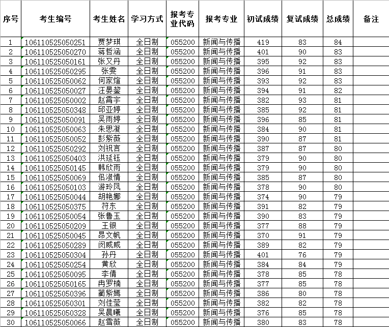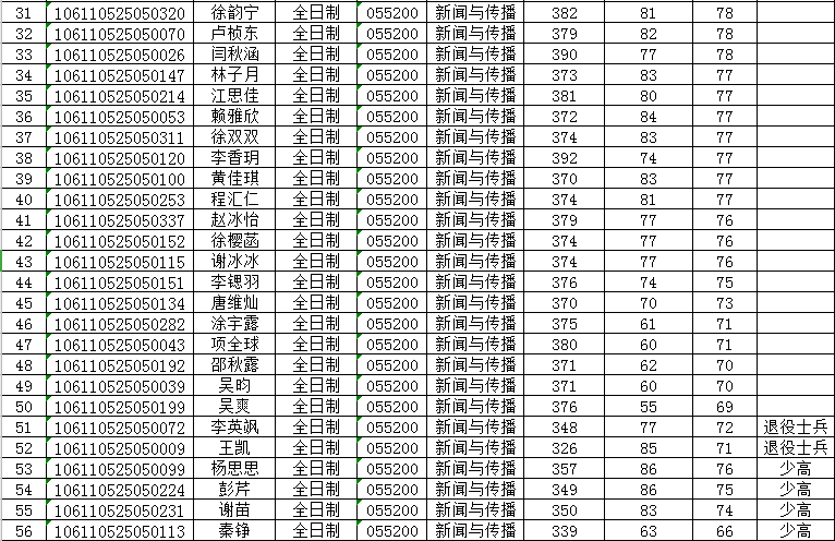 新闻与传播(专业学位)招生名额61名(其中已录取推免生15名),复试成绩公示如下: