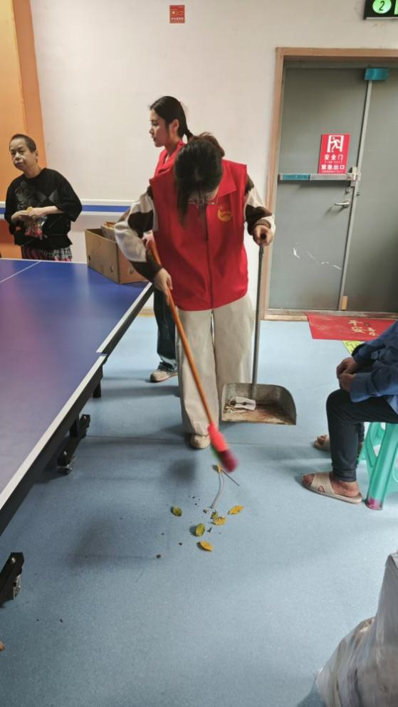 活动尾声,志愿者们分组为养老院打扫卫生。一部分负责打扫房间,包括整理床铺、擦拭家具、清扫地面等;另一部分则负责公共区域的清洁,如走廊、花园、活动室等,确保养老院的环境整洁舒适。志愿者们希望通过打扫卫生的方式,帮助养老院为老人们提供整洁舒适的环境,为老人们尽一份心意。