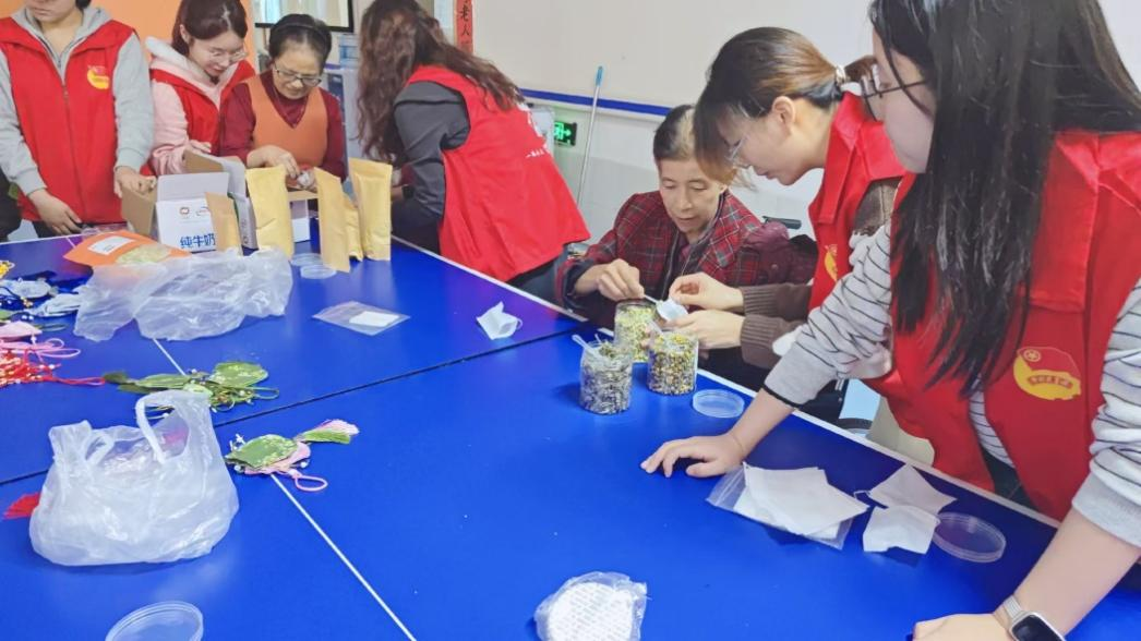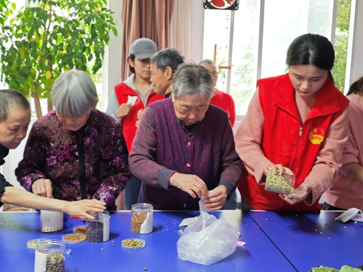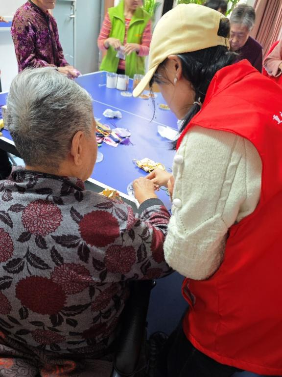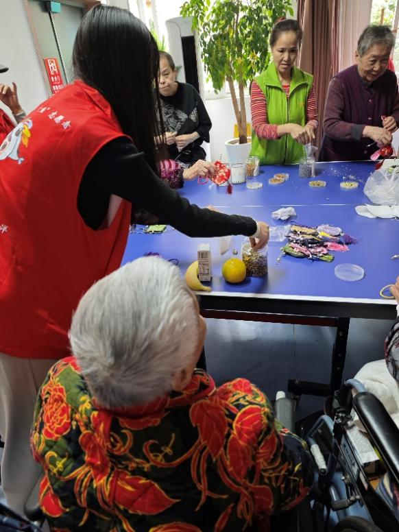 紧接着,在养老院的活动室内,志愿者们手把手教老人们如何制作香囊。志愿者们将提前准备好的材料铺陈在桌面上,方便老人们拿取。在制作过程中,志愿者们细致为老人们讲解步骤,并教老人们如何将不同香囊内芯(艾草、薰衣草、茉莉花等)塞入香囊空袋中。老人们亲自动手,兴致勃勃。香囊具有驱邪避秽的寓意,体现了重阳节的传统习俗。志愿者希望通过制作香囊,让老人们感受到九九重阳的节日氛围。