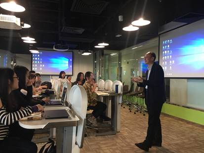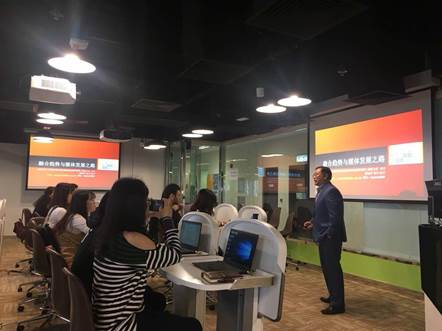 “每一个学生都需要与当下时代的发展和变化深度链接,只有辨识到用户需要什么,才能让新闻在这个时代立足。”李文首先以“融合趋势与媒体发展之路”为题为访学团成员讲授了当前媒体融合的发展趋势和传媒行业的转型过程。李文认为,广义上的媒体融合应该是一切媒介及其有关要素的融合,这种融合不仅包括媒介形态的融合,还要包括媒介功能、传播手段、所有权以及组织结构等要素的融合,是技术融合、服务融合、市场融合的产物,是用户生态、生产方式的多元搭配。李文自1991年便开始供职于英国广播电视公司(BBC),亲历了传媒行业的发展转型之路,经验丰富。“我见证了从报纸广播到电视再到互联网的发展历程,深感当前媒介融合正在激烈重组,机遇与挑战并存,发展与困难交织。”