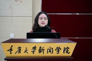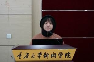 2016级本科生王悦月以“行走此间,孜求新闻专业与理想”为题进行了经验交流。她谈到,同学们我们应树立远大理想,提升专业素养,积极发扬记者精神。